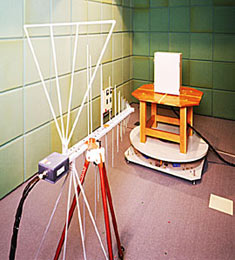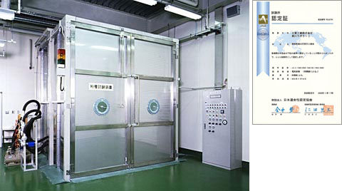 电波暗室的构造是,使从电子设备放射出来的电波不产生壁面反射,同时还可以遮断外部电波的侵装。使用电波暗室,针对免疫性试验性能和电磁屏蔽性能进行试验。